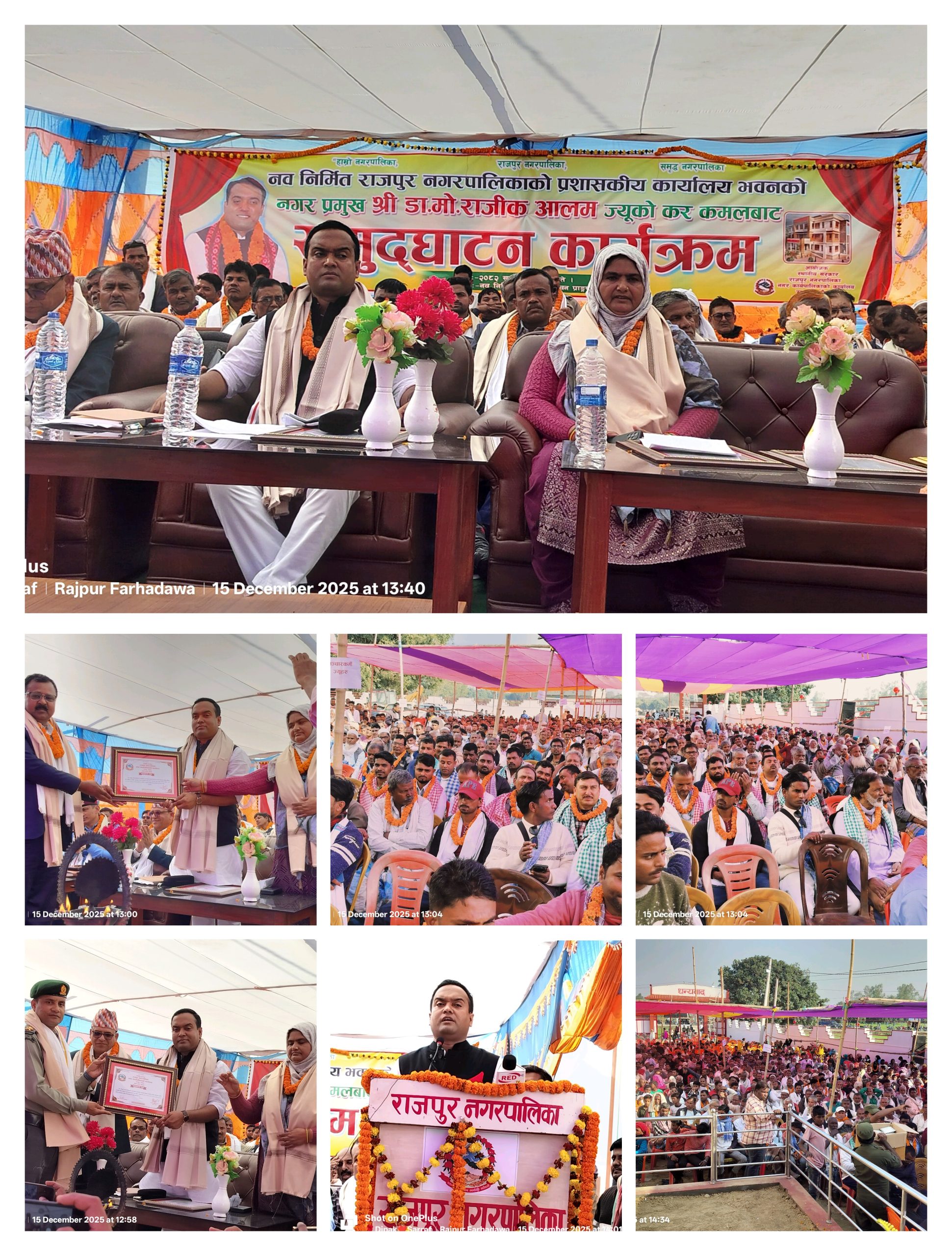 राजपुर नगरपालिकाले नवनिर्मित प्रशासकीय भवनको भव्य उद्घाटन आज एक विशेष समारोहका साथ सम्पन्न गरेको छ। नगर प्रमुख डा. मो. राजिक आलम ज्यू द्वारा रिबन काटेर र शिलालेख अनावरण गरी भवनको औपचारिक रूपमा उद्घाटन गरिएको हो।
